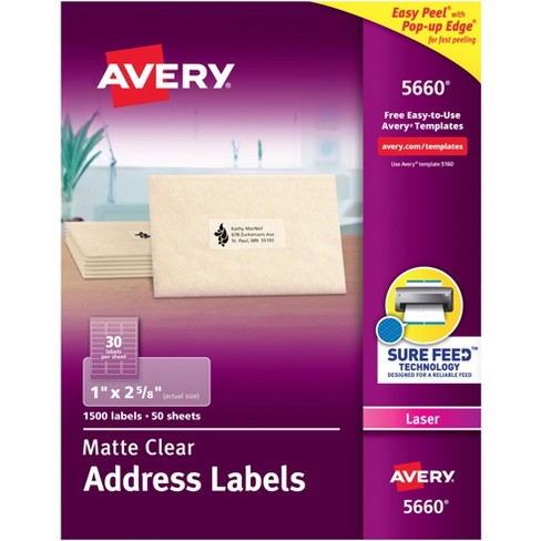 Avery Easy Peel Permanent-Adhesive Address Labels For Laser Printers, 1 x 2-5/8 Inches, Clear, Box of 1500